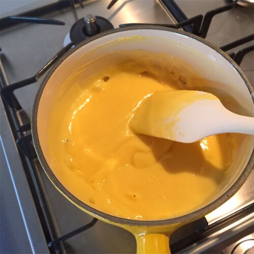 卵黄多めで、最後にバターを入れて作る濃いめのカスタードです。このバター入りが好きなのにバターを入れるのを毎回忘れそうになります。計量することすら忘れていたりして、半分くらいの確率で入れ忘れます。カスタードが炊けるとほっとしてしまうからかも…