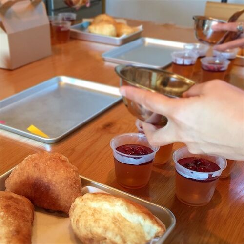 お持ち帰り用のゼリーの仕上げです。 ジャスミンティとシナモンの組み合わせは、 オリエンタルな感じがします。 ジャスミン、シナモン、赤ワインの 香りのデザートです。