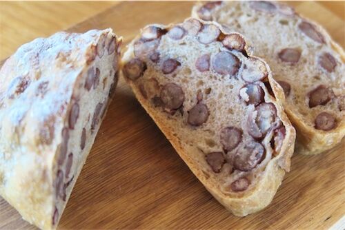 カンパーニュの生地で甘納豆を包んでみました。 ほのかに酸味がある生地に甘い小豆がよく合います。 いちご大福的な美味しさです。