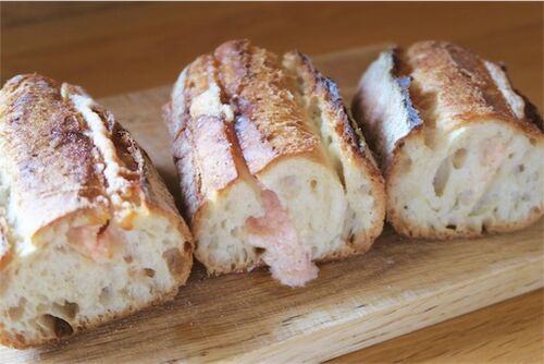 買ってきたバケットに めんたい+バター+マヨネーズを挟んで びしゃびしゃに水で濡らして カリッとするまで焼きました。 焼きたて、最高です。