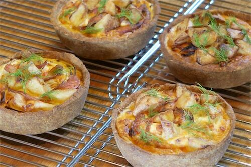 スモークサーモン、 クリームチーズ、 じゃがいも、 玉ねぎ、 ケッパー、 モッツァレラチーズ入り。 スモークサーモンとクリームチーズは よくある組み合わせですが、 キッシュにしてもよく合いますね。 そして、玉ねぎとじゃがいもの甘みを クリームチーズ…